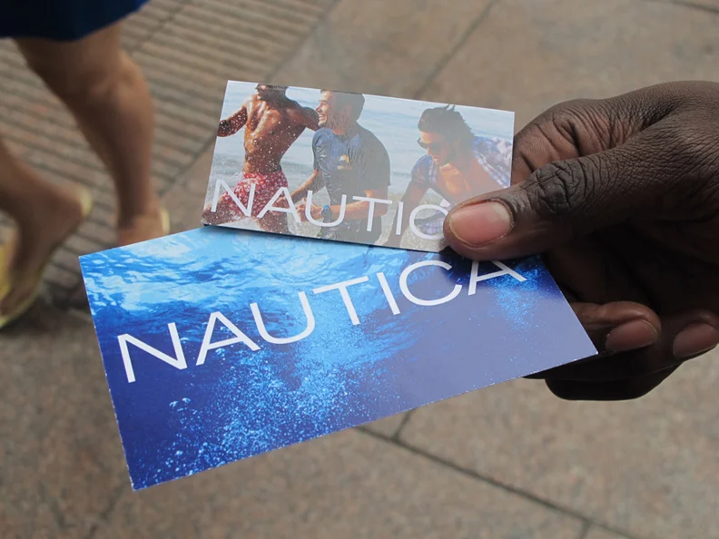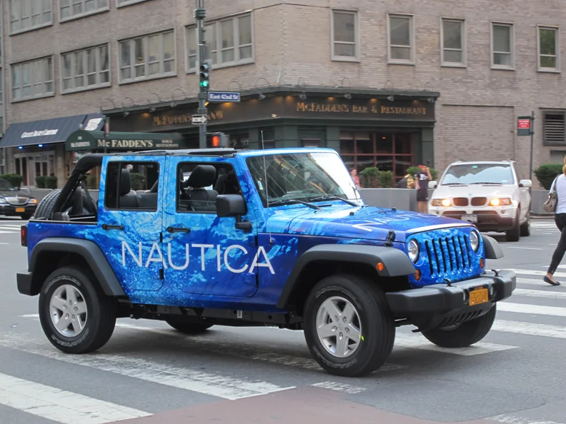 Show Media branded 10 Jeep Wranglers gave complimentary rides to commuters from both Grand Central and Penn Station, as well as shoppers at Macy's and Lord & Taylor. With a team of 10 brand ambassadors, thousands of coupons, and product samples, Nautica was able to give the riders and NYC pedestrians something to talk about. As passengers entered the jeeps, they were able to use an interactive tablet that featured a promo video as well as access to Nautica's website, allowing them to view various items. The vehicles were even featured on Pix11's morning news broadcast.