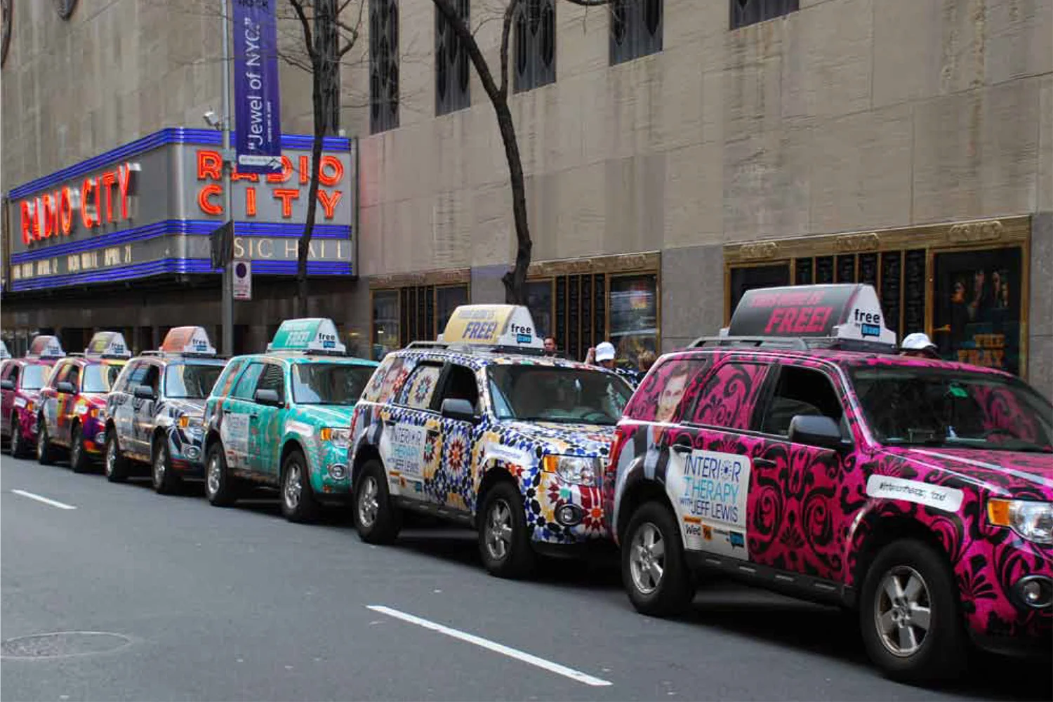 With 10 branded "Interior Therapy" SUV’s parading the streets of NYC, Show Media delivered passengers to their destinations at no cost. The SUV interiors were completely transformed, each representing a different design concept, allowing for the passenger to have an unparalleled experience while boosting one’s mood. Tablets were installed in the SUV’s that gave riders a preview of the new show. Brand Ambassadors, fitted in Interior Therapy clothing, assisted the event in handing out flyers and riding in the passenger seat during every ride in order to answer questions and relay appropriate show information.