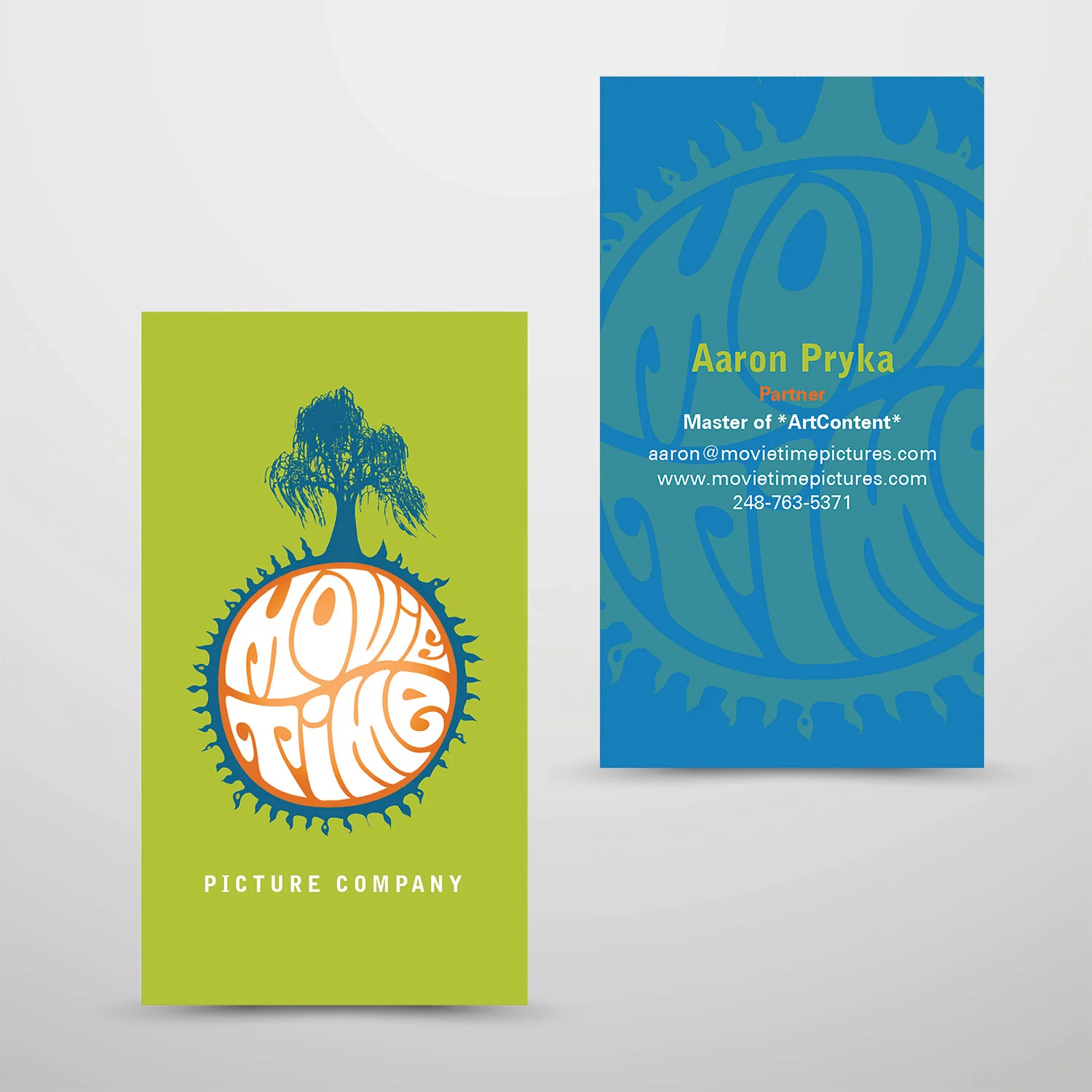 Business card design featuring the new Movie Time Picture Company branding.