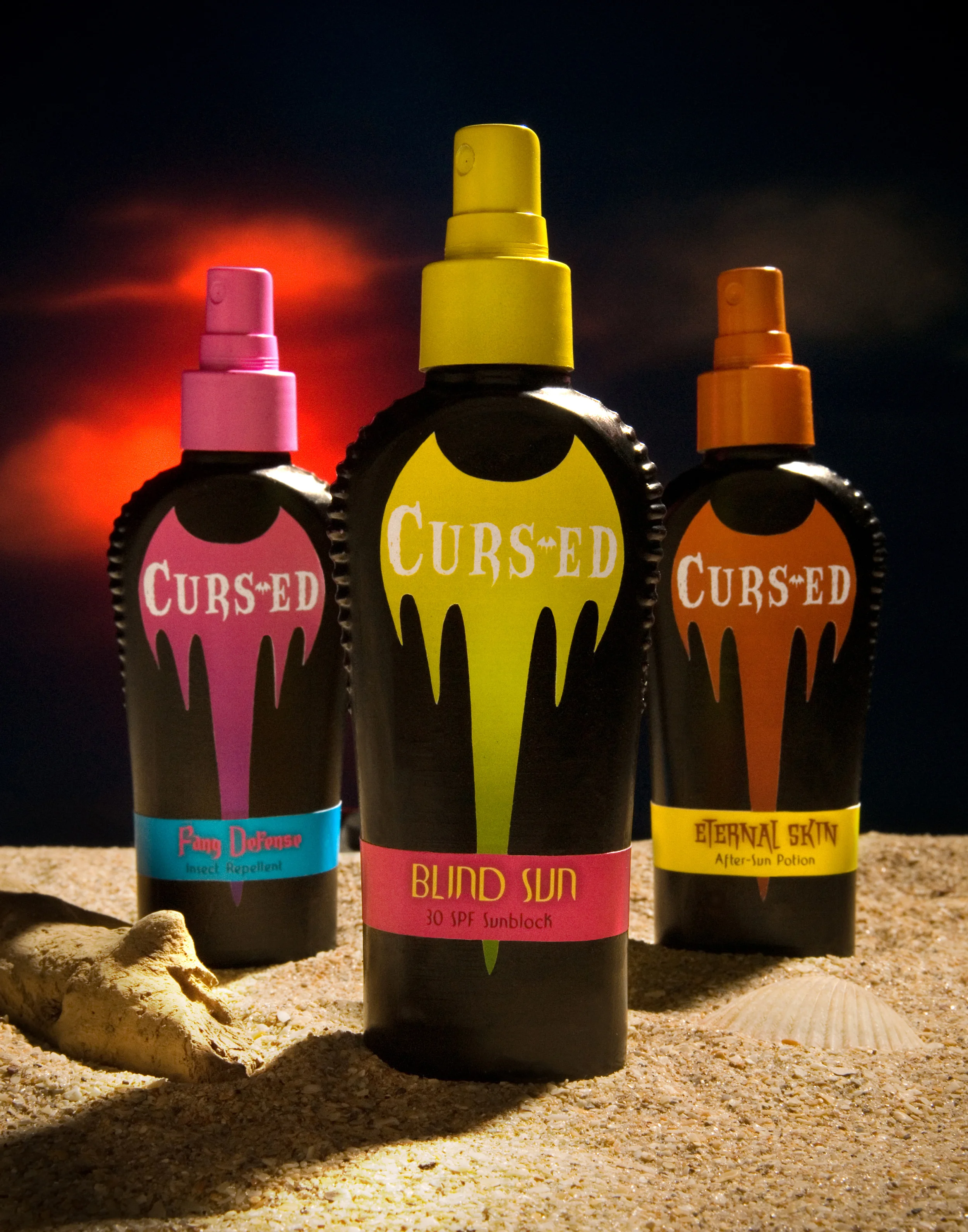 Curse-ed is a vampire-themed line of skincare products for children I created in college. As a ghostly pale kid of Scottish/Irish heritage I was constantly getting sunburnt because I hated the ritual of rubbing on greasy sunblock. With Curs-ed, preventative skincare becomes fun for kids through make-believing they are vampires that can't go outside without their spray. Products include "Blind Sun" SPF sunblock, "Fang Defense" bug spray, and "Eternal Skin" after-sun potion.